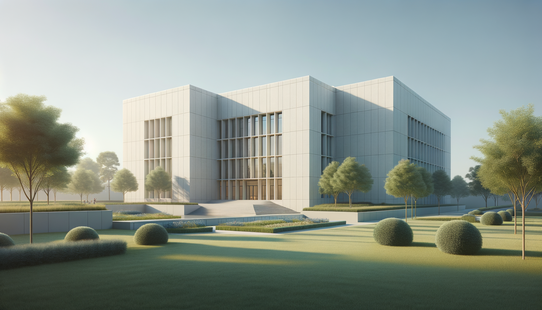 Empty conference room with rows of tables and chairs facing a large projection screen, with windows on the right side allowing natural light.